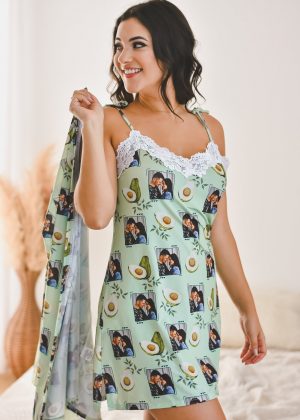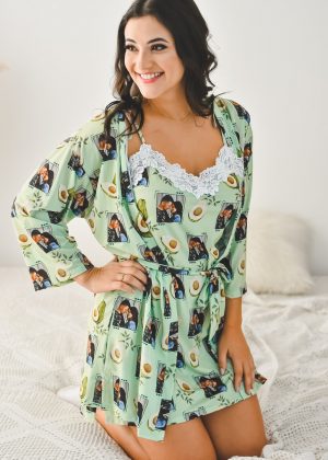 A camisola possui fechamento e regulagem com amarração nos ombros, fenda lateral e detalhes em renda no busto, já o hobby possui fechamento e regulagem através de tiras de amarração, e mangas três quartos.